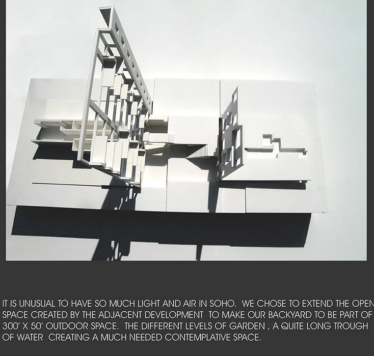The new building facing West Broadway is designed to be a modern, 21st century building with as much of the richness of the late 19th century cast iron buildings as possible. Large windows, fire escapes, typical repetitive monumentality of a Soho building, and increased ceiling heights as the buildings reach the ground to receive the most amount of daylight during the day, were used to set the proportions of the new façade.